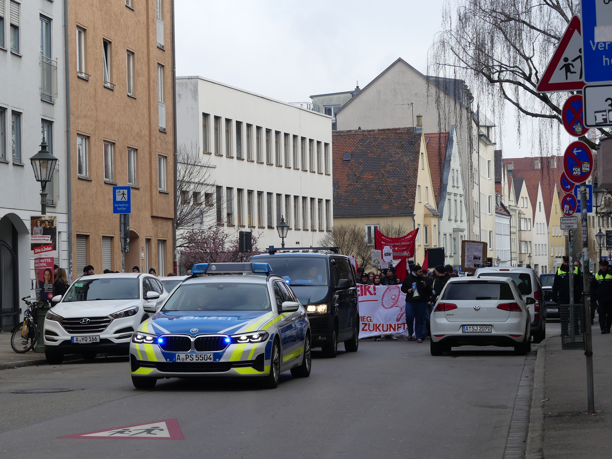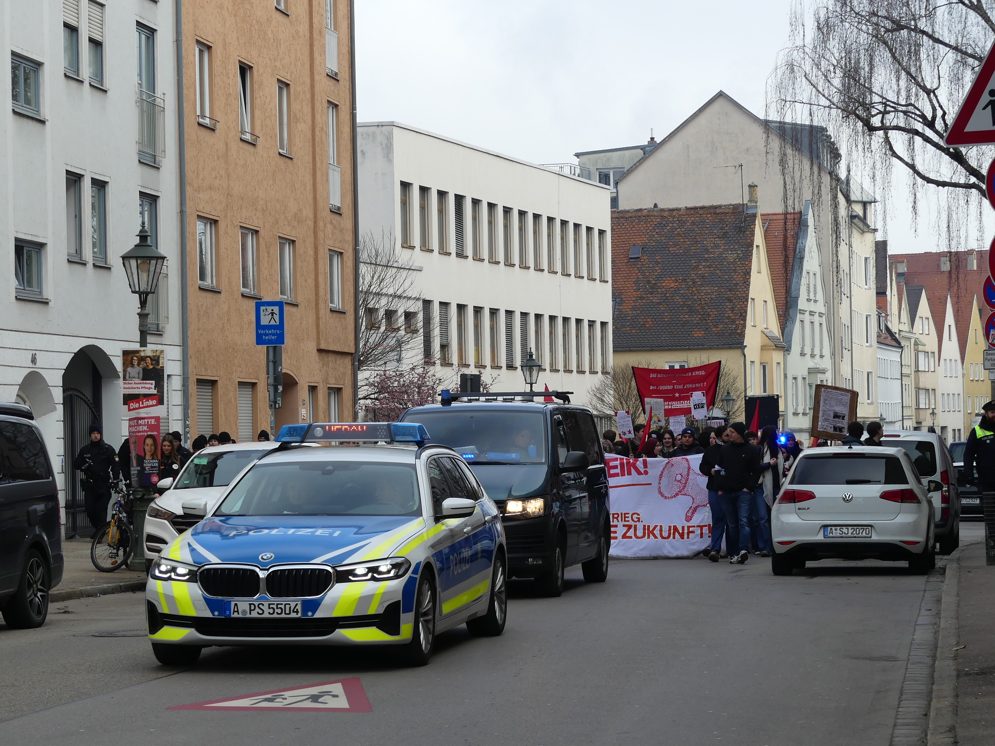 Am Vormittag des 4. März 2026 versammelten sich rund 100 Personen, darunter Schülerinnen und Schüler sowie Gruppierungen aus dem linkspolitischen und antifaschistischen Spektrum, zu einem Aufzug gegen die Wehrpflicht. Die mobile Demonstration nahm ihren Anfang in der Bürgermeister-Fischer-Straße und zog durch die Innenstadt bis zum Peutinger-Gymnasium.