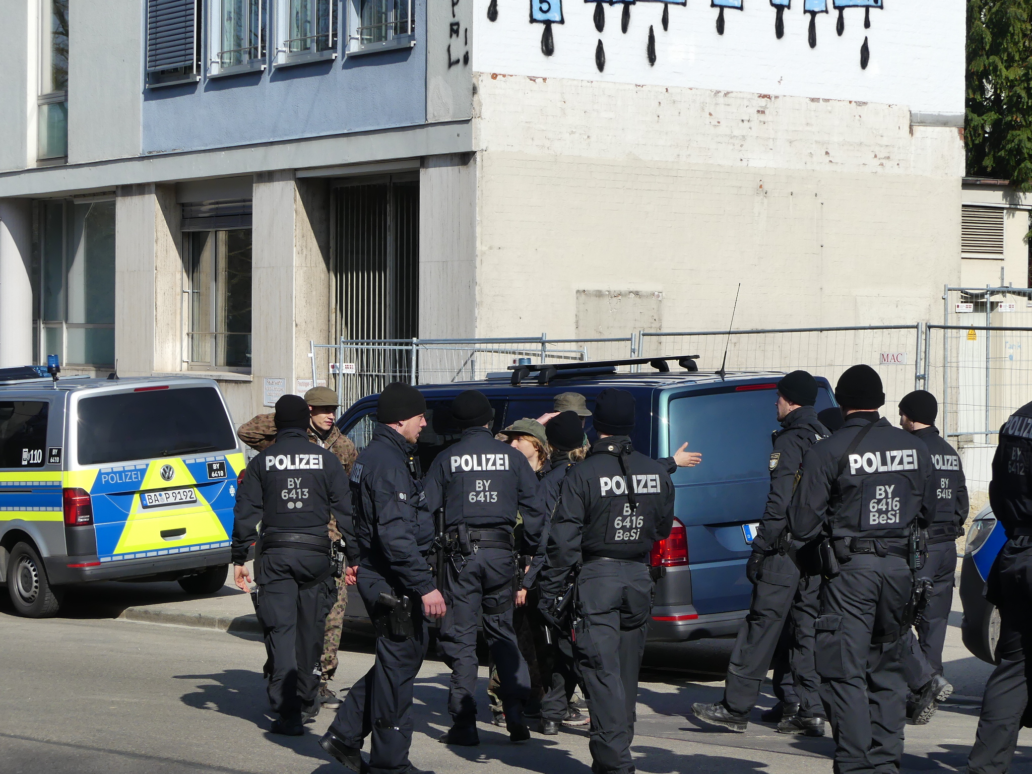 Besondere Vorkommnisse: Ein Teilnehmer, der eine militärähnliche Uniform trug, sorgte während des Aufzugs für Aufmerksamkeit, indem er sich mehrfach demonstrativ vor den Einsatzkräften des E-Zugs der bayerischen Polizei (Einsatzzug) hinkniete. Er forderte dabei auf symbolische Weise seine eigene Festnahme.