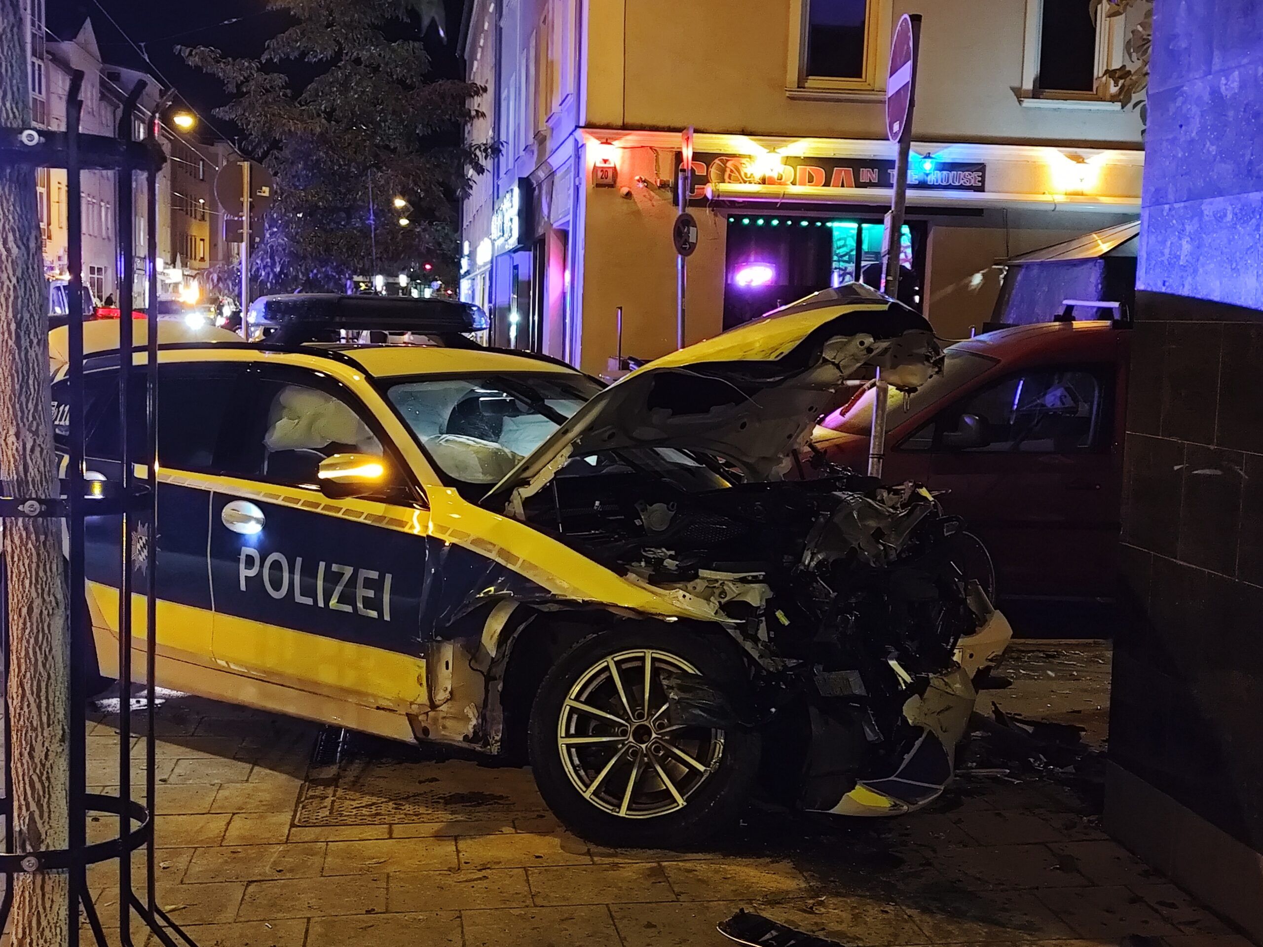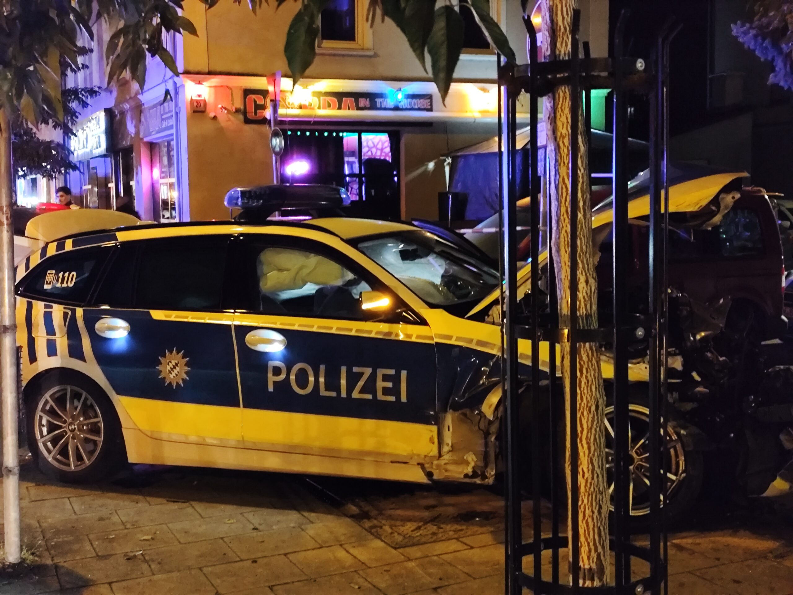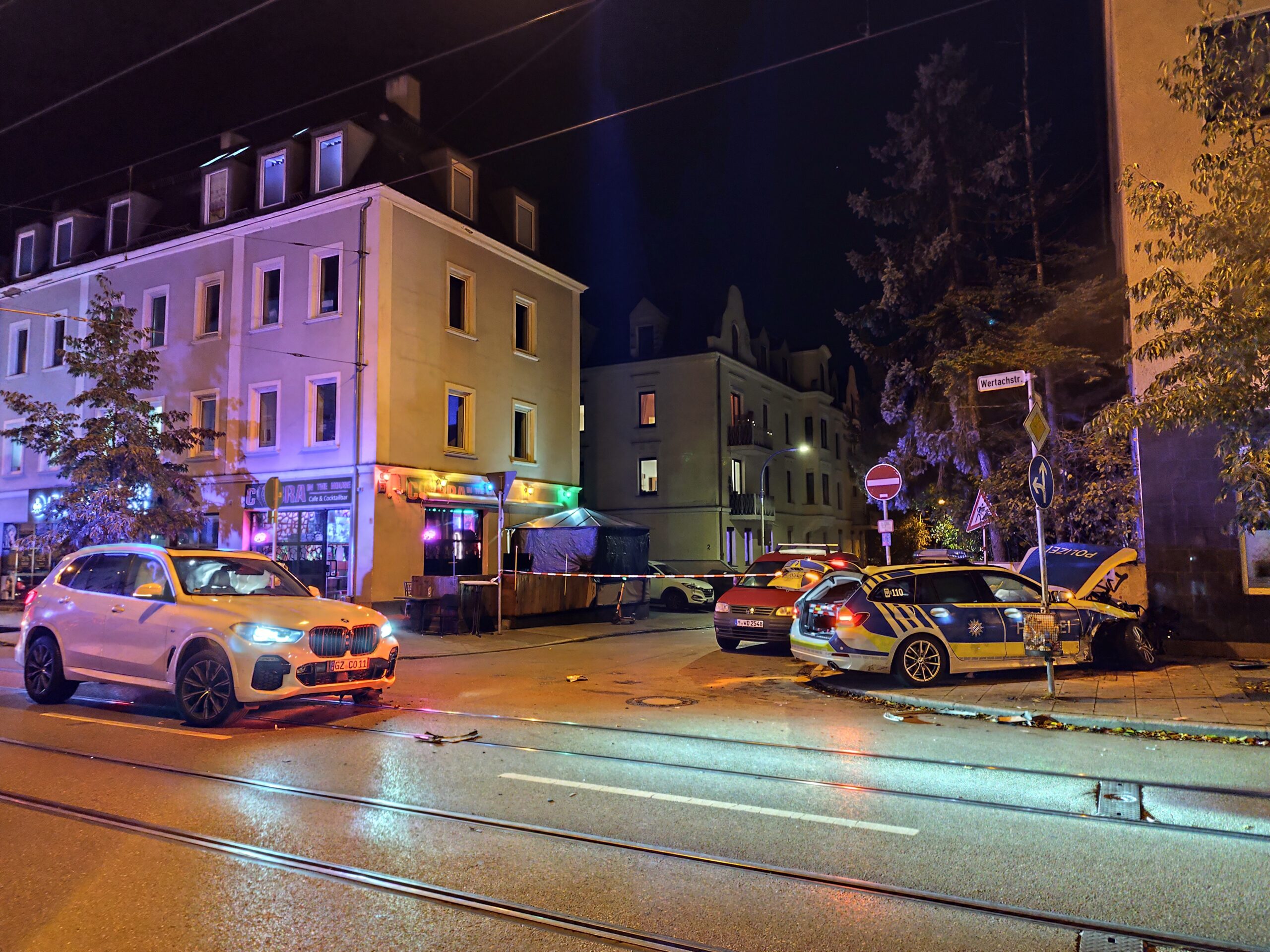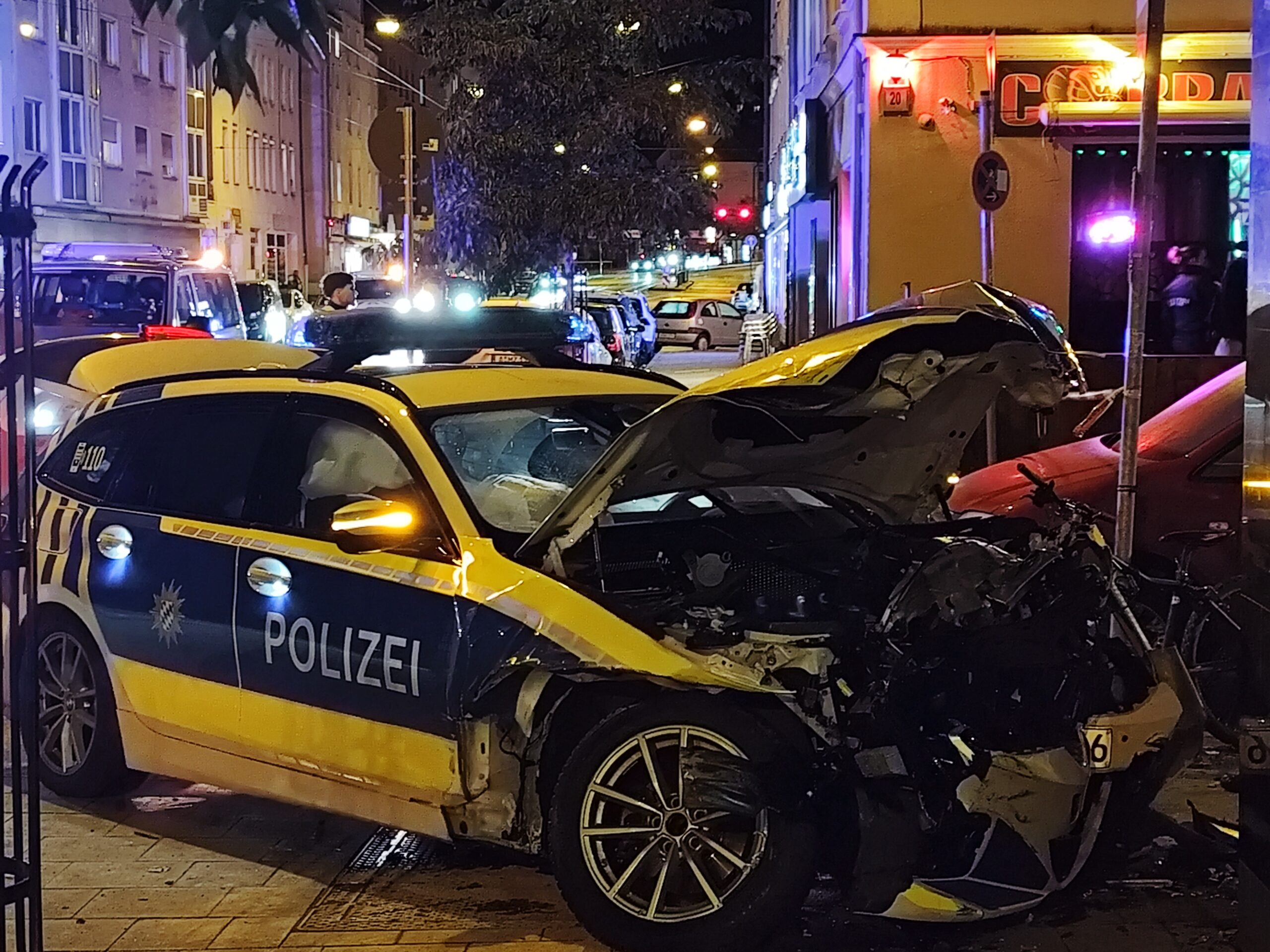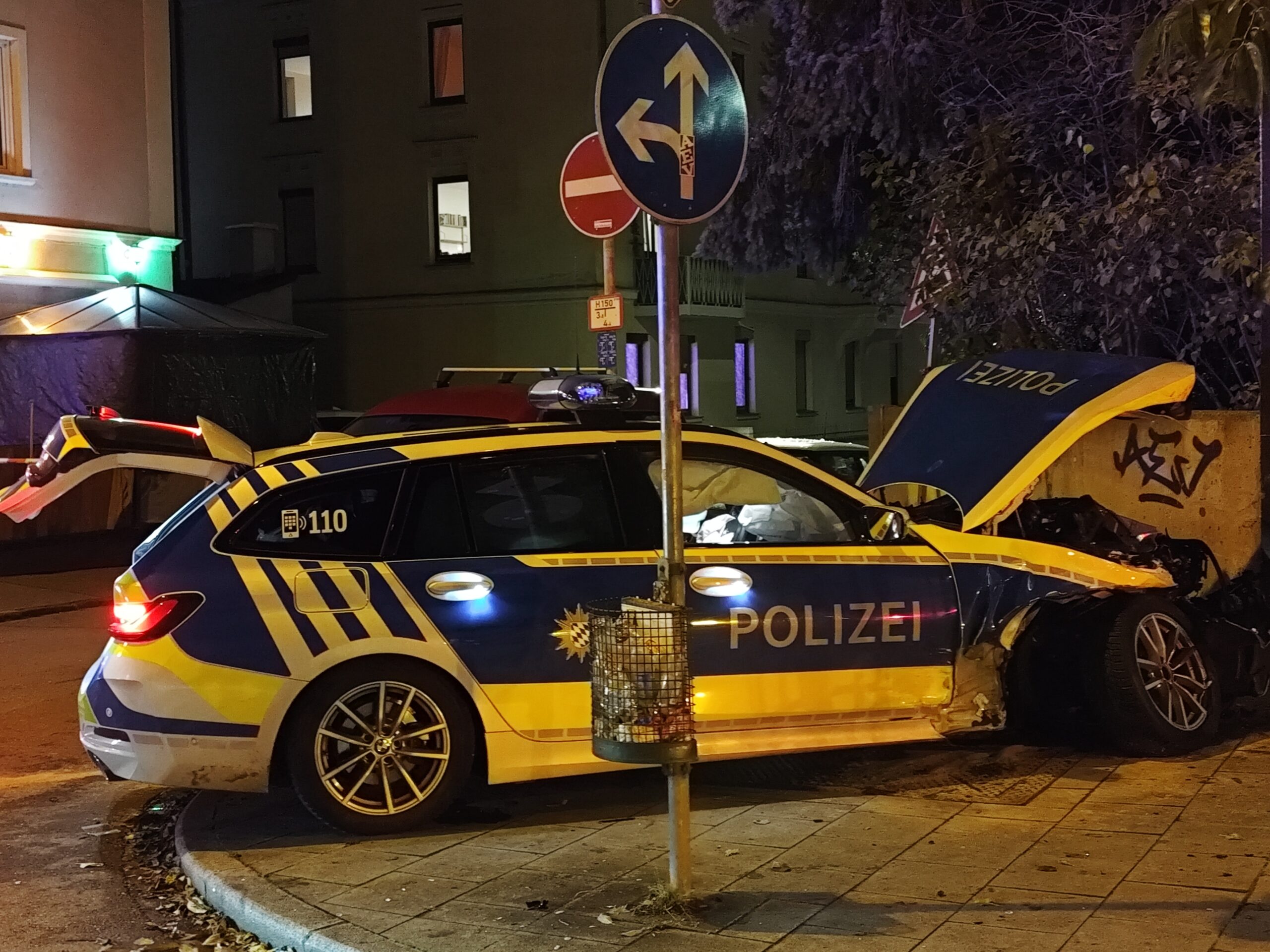 Gegen 22.30 Uhr war eine Polizeistreife mit Blaulicht zu einem Einsatz unterwegs. Dabei überholte die Streife in der Wertachstraße einen BMW. Dessen 71-jähriger Fahrer bog nach derzeitigem Stand unvermittelt nach links ab, um offenbar verbotenerweise, entgegen der Fahrtrichtung, in die Mittelstraße einzufahren. Bei der Mittelstraße handelt es sich um eine Einbahnstraße. Dabei stießen der BMW und das Streifenfahrzeug zusammen. Das Streifenfahrzeug kollidierte anschließend mit einer dortigen Hausfassade.